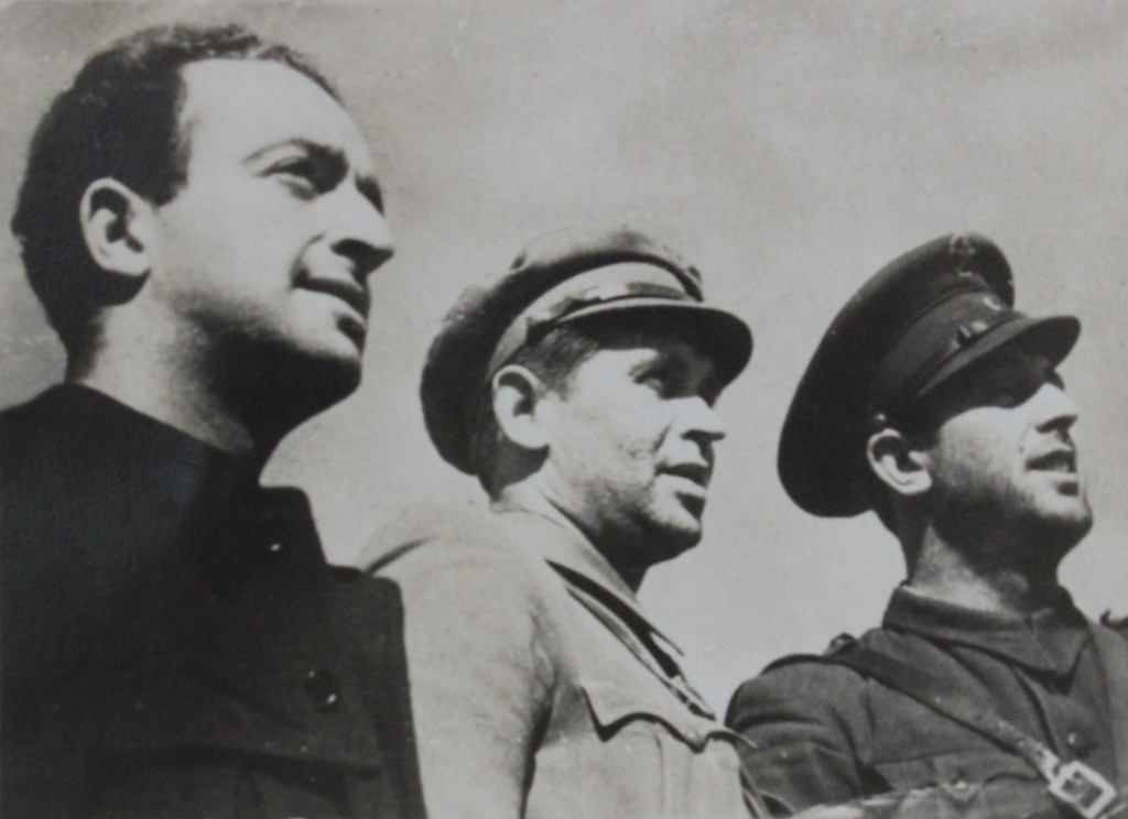 Úa imaxe d’Emilio nos tempos da guerra. El militar da dereta de todo leva na gorra el distintivo de comisario político.