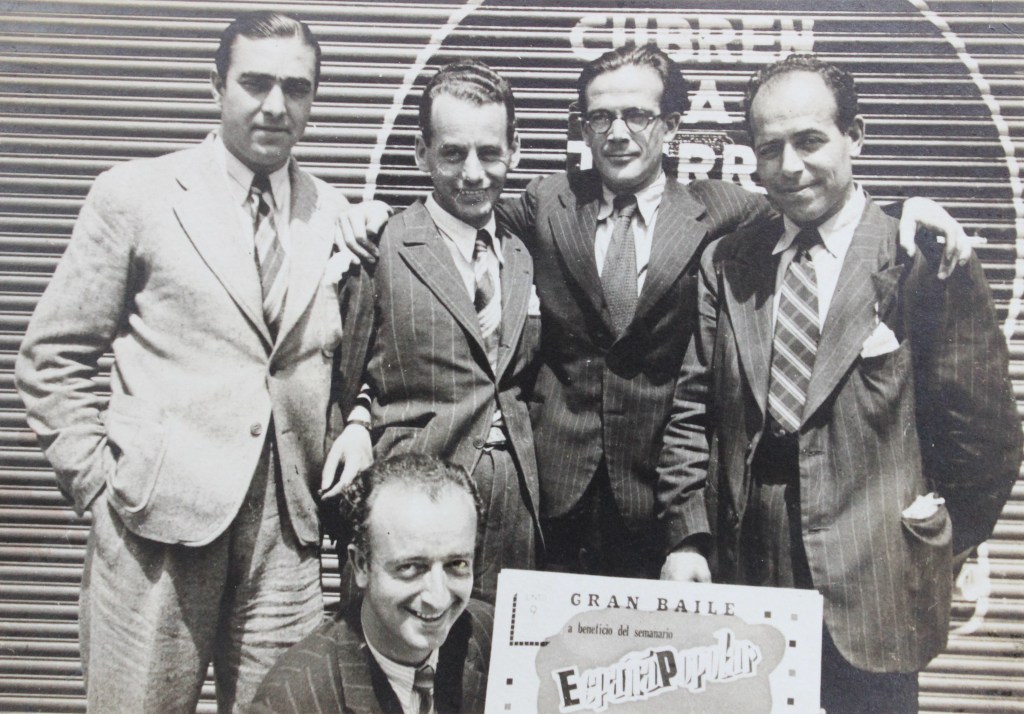 Emilio cos sous compañeiros de partido anunciando un baile pra recaudar fondos prá revista del PCE «España Popular». El primeiro á esquerda é Antonio Camacho, secretario d’organización.