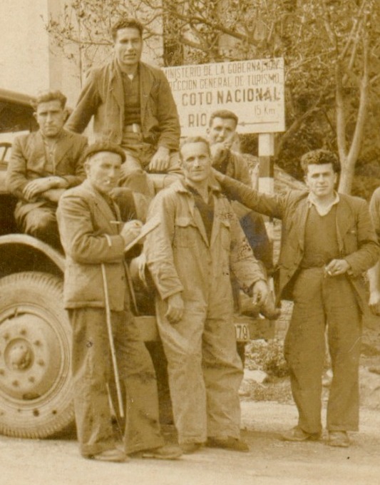 Longinos Álvarez Vijande en 1944, arrodiao dos compañeiros del trabayo. Nel pico del capó del camión ta Gerardo Álvarez Rodríguez, que pasara por un batallón de soldaos trabayadores despóis de lluitar nas filas republicanas.