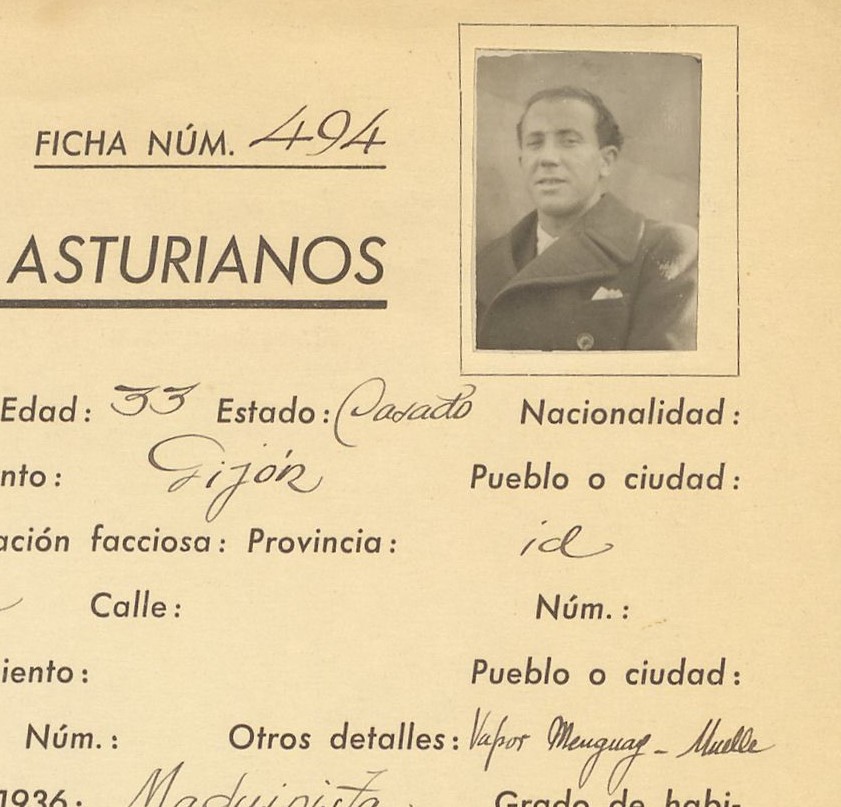 Detalle da ficha d’afiliación de Manolo Cerdeira al Agrupación de Socialistas Asturianos en Barcelona (1938).